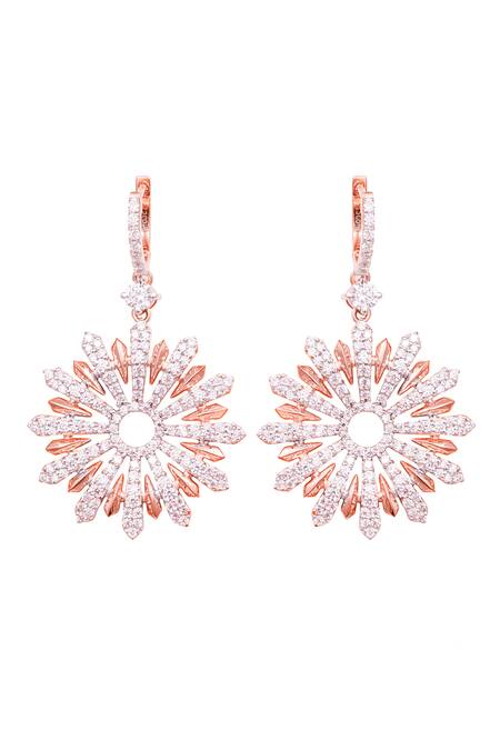 Rose gold plated dangler earrings featuring imported cubic zirconia stones in a sunbeam pattern