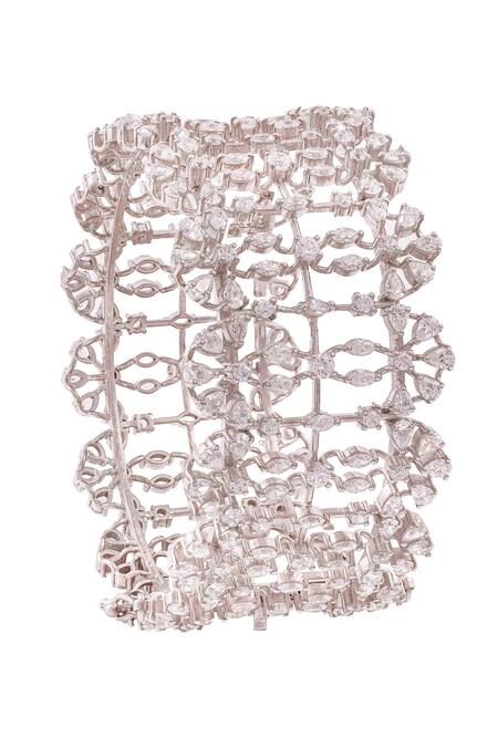 White plated bracelet featuring floral motifs studded with marquis, round, and pear cut cubic zirconia stones