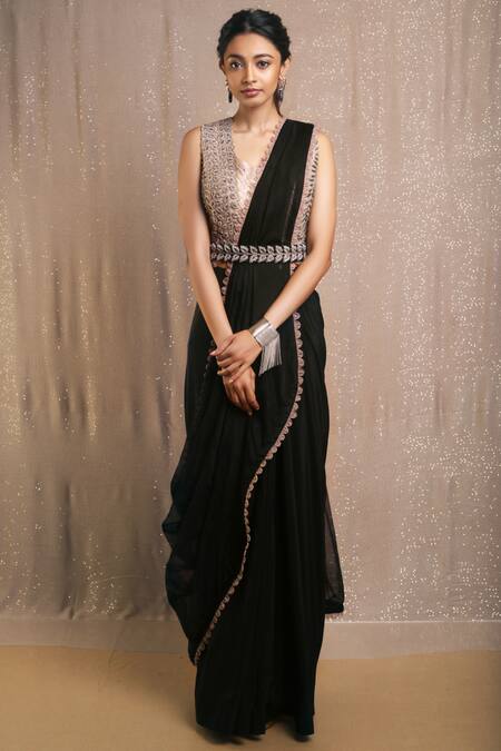 Black pre-stitched saree paired with grey zardosi embroidered blouse.