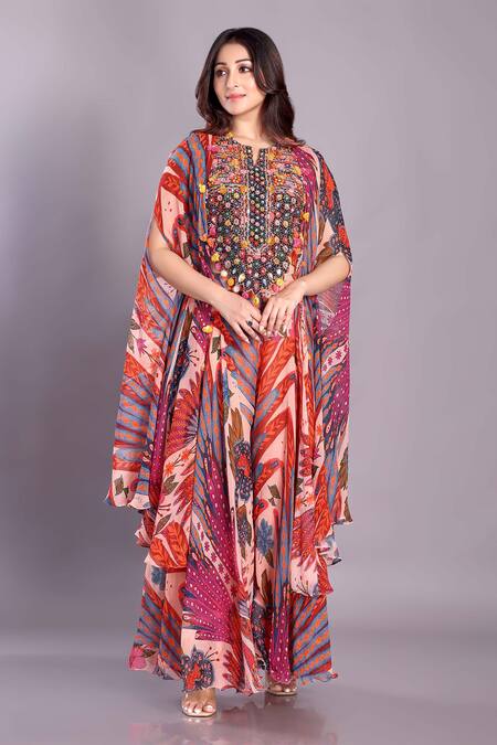 Multi Color Chiffon Sequins, Embroidery Bird Print High Low Cape And Sharara Set