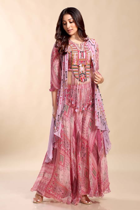 Multicolor organza open jacket featuring thread work and an asymmetric hem. Paired with a folklore fusion blouse and printed sharara.