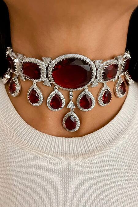 Handmade design featuring varying shapes and sizes of stones., Intricate detailing with semi-precious stones in ruby red.