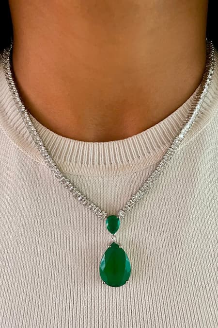 Emerald necklace featuring diamond stones and a teardrop pendant. Accompanied by matching earrings, ring, and bracelet.