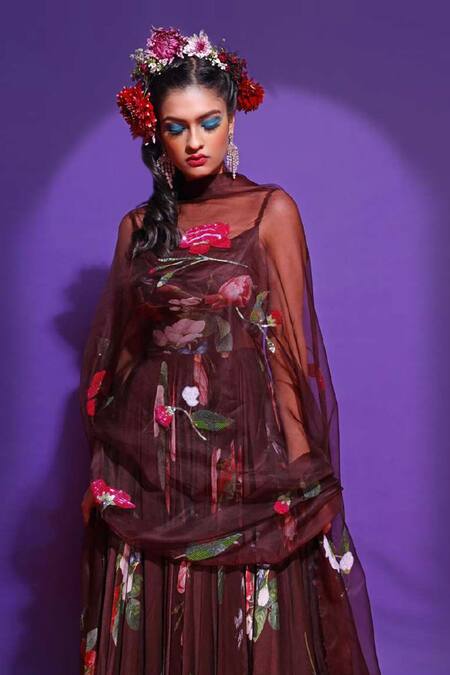 Brown anarkali with all-over floral motif work. Comes with embroidered dupatta.