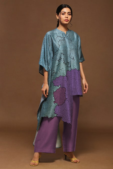Metallic blue kurta with abstract printed motifs and asymmetrical hem. Comes with printed pants.