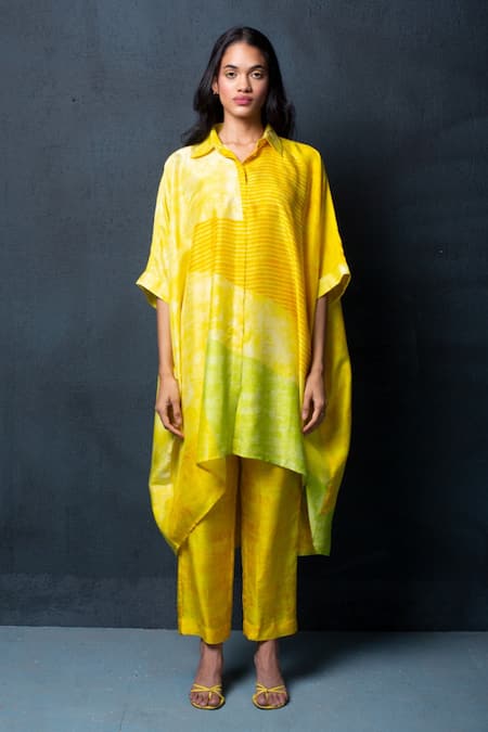 Lemon & light yellow draped shirt tunic with geometric abstract print. Paired with printed pant.