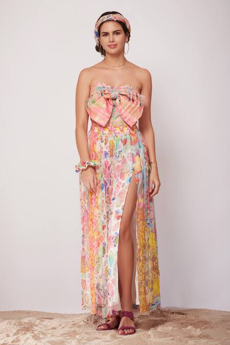 Multicoloured cotton linen strapless top in paisley checkered print with bow front.