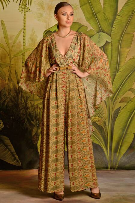 Beige cape-style jumpsuit with all-over abstract print & asymmetric sleeves.