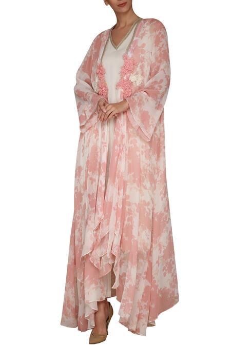 Pink & ivory cape with all over printed motifs & placement floral embroidery. Comes with kurta & pants.