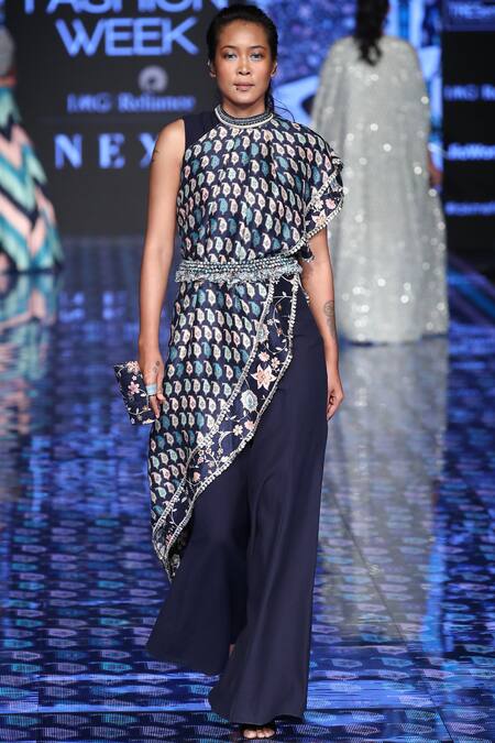 Blue denim crop top with attached floral printed drape. Comes with flared pants & embellished belt.