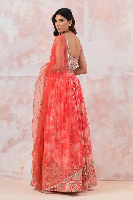Pink lehenga featuring floral embroidery and abstract print. Paired with an embroidered padded blouse and a sheer embroidered dupatta.