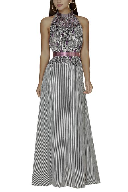 Purple & off white gown with all over stripe & abstract print motif. Comes with belt.