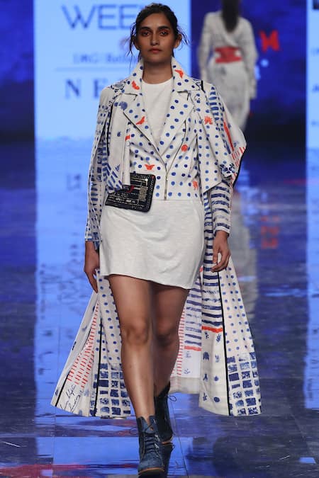 White long jacket with all over polka dot & stripe print motif. Comes with biker style inner jacket.