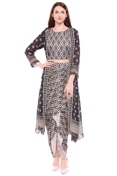 Black crop top with all-over ikat printed motifs. Comes with matching draped skirt & printed organza jacket.
