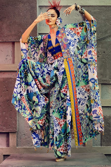 Buy_Diyarajvvir_Multi Color Georgette, Cotton Silk Aztec Kaftan Open Printed Jumpsuit With _at_Aza_Fashions