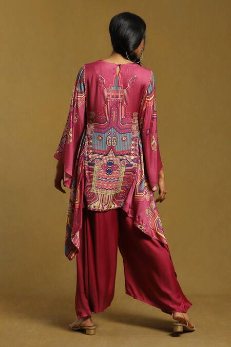 Purple kaftan style kurta featuring geometric circuit pattern prints, paired with palazzo. The kurta has batwing sleeves and a round neckline with an asymmetric hem cut.