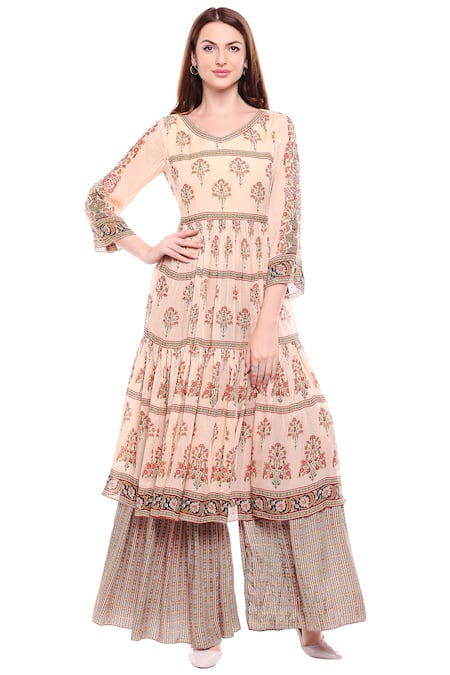 Beige flared kurta with Madhubani printed motifs & sequin embellishment. Comes with printed palazzo pants.