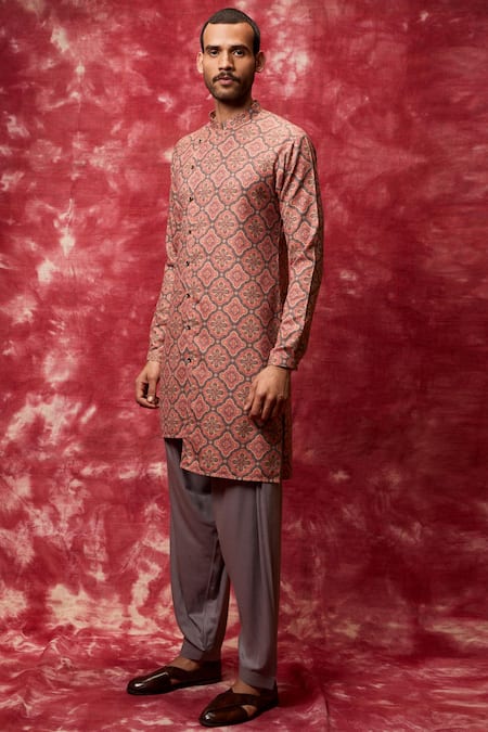 Grey, orange asymmetric kurta with print all over. Paired with trousers.