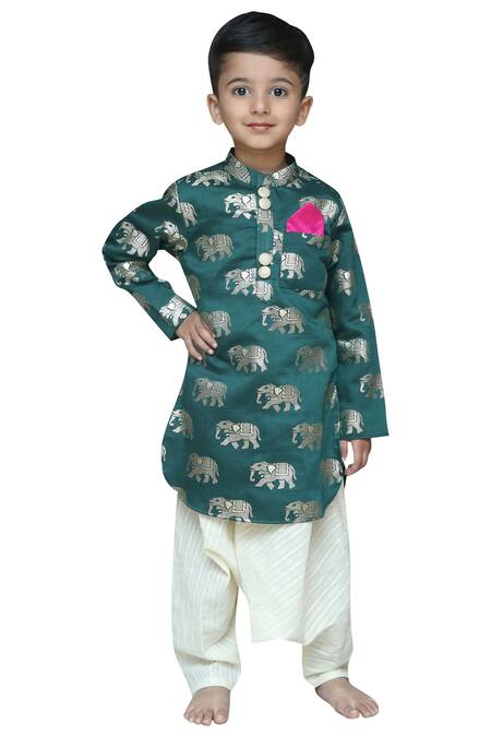 Green kurta with elephant motif print. Comes with off white dhoti pants.