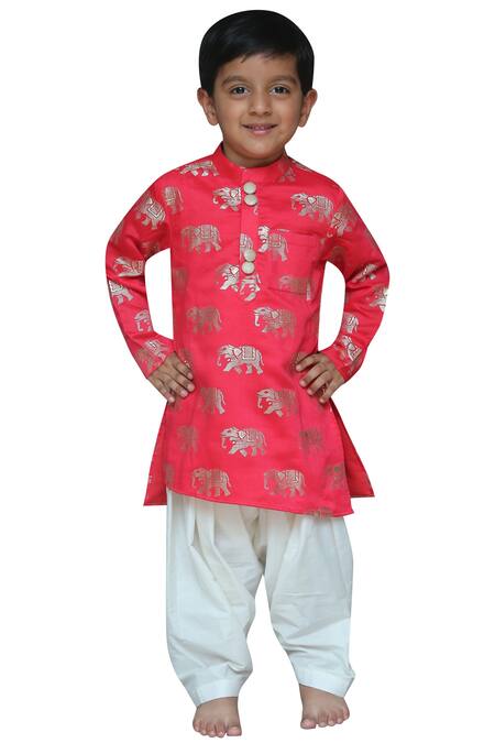 Red elephant motif print kurta paired with off white draped pants.