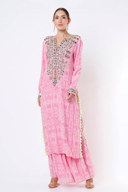 Pink crepe kurta with all-over prints & embroidered yoke. Comes wit one frill sharara.