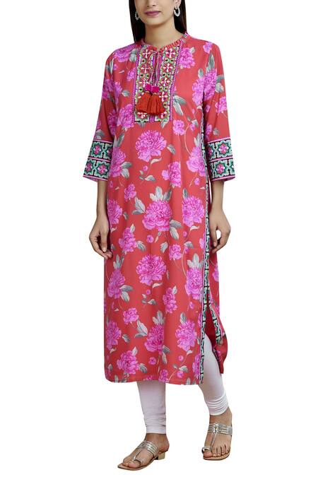 Red long kurta with all over floral print motif & front embroidered yoke.