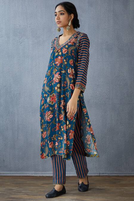 Buy_Torani_Blue Cotton Silk Printed Kurta_at_Aza_Fashions