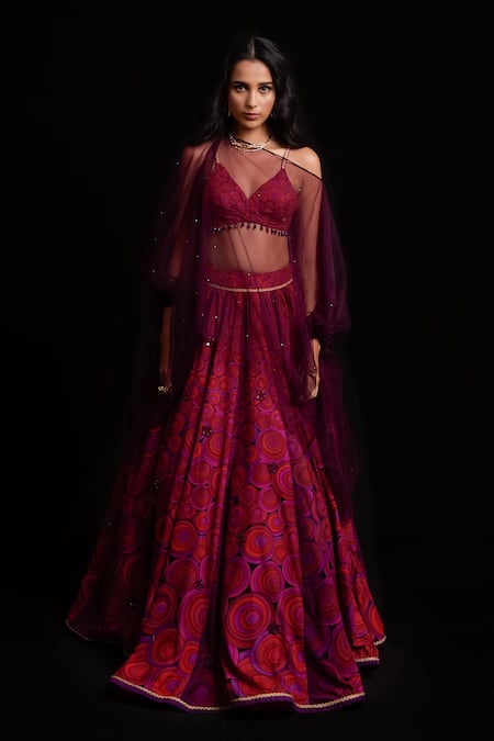Multicolor lehenga with orbit printed motifs & mirror work embroidery. Paired with bralette blouse & tulle kaftan.
