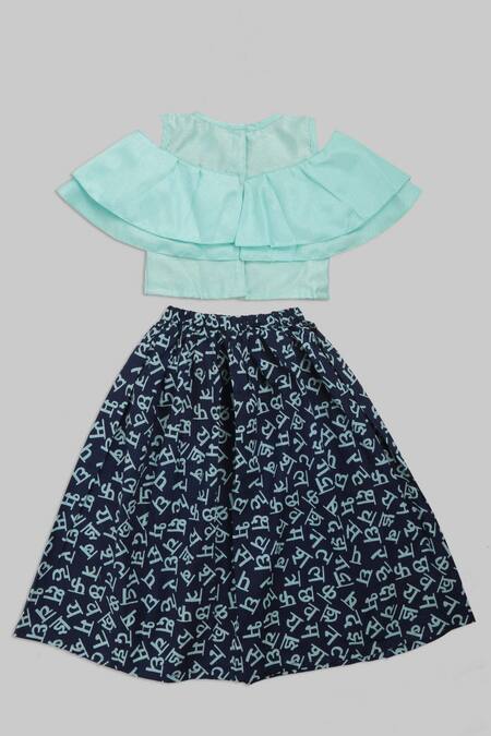 Blue lehenga with Devnagri printed motifs. Comes with overlap ruffle top.