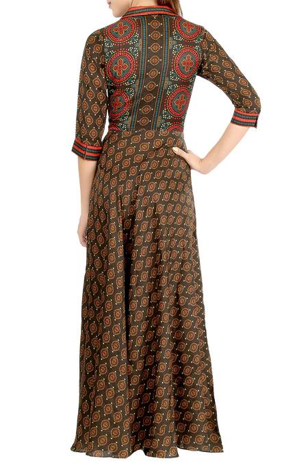 Brown Crepe Spread Collar Printed Maxi Dress