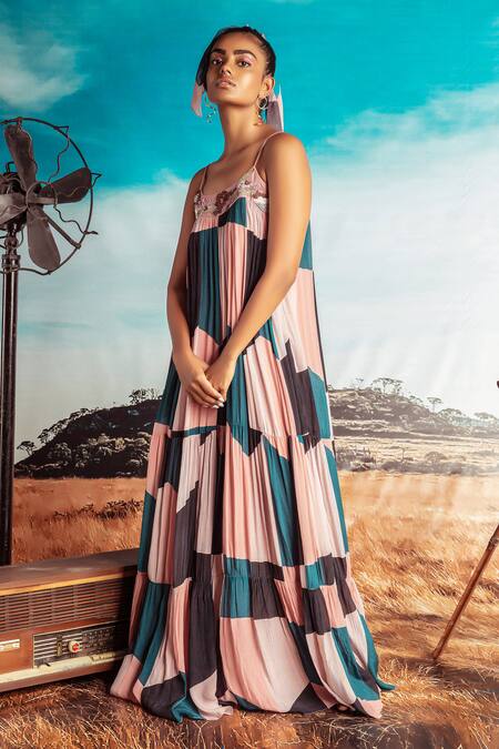 Buy_Nirmooha_Multi Color Georgette Round Printed Maxi Dress_at_Aza_Fashions