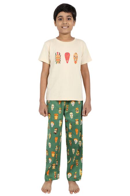 Beige T-shirt with mask printed motif. Comes with green printed pyjama.