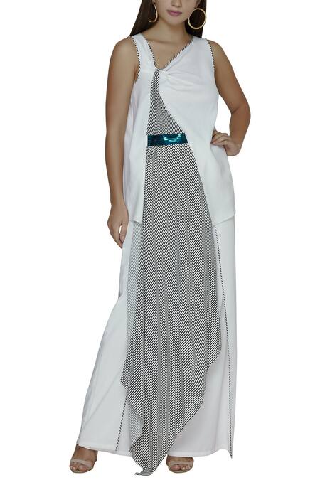Ivory & black top with striped print extended panel. Comes with teal belt.