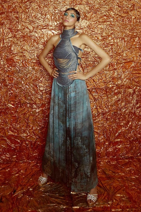 Grey Velvet, Chiffon, Lurex High Collar Printed Pant And Bustier Set