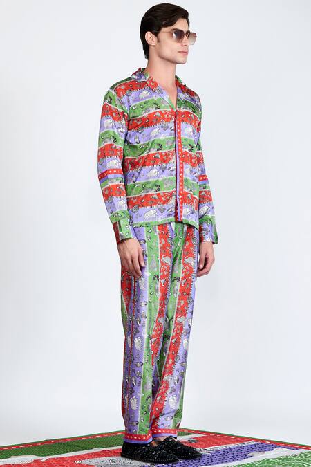Multi color striped shirt with all-over animal printed motifs. Comes with matching pyjamas.