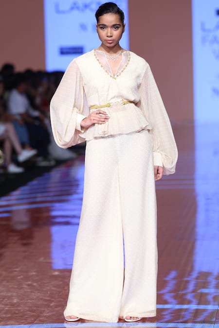 Ivory chiffon peplum style top with all-over printed motifs & embellished neckline. Comes with matching flared pants & rope belt.