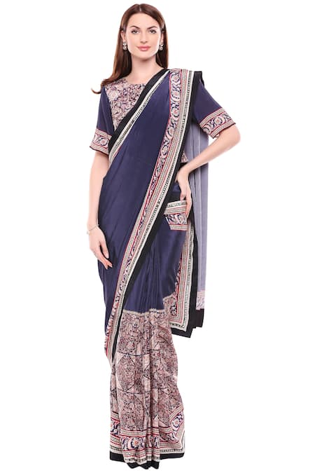 Blue pre-draped saree with printed motifs & sequin embellishments. Comes with a Madhubani printed blouse.