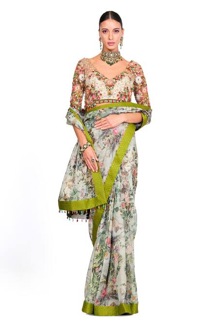 Multi Color Organza Floral, Sequin, Tassel V Neck Printed Saree With Blouse