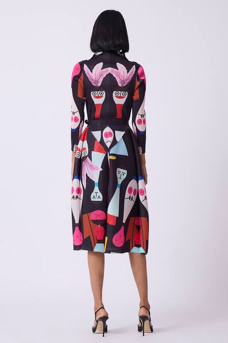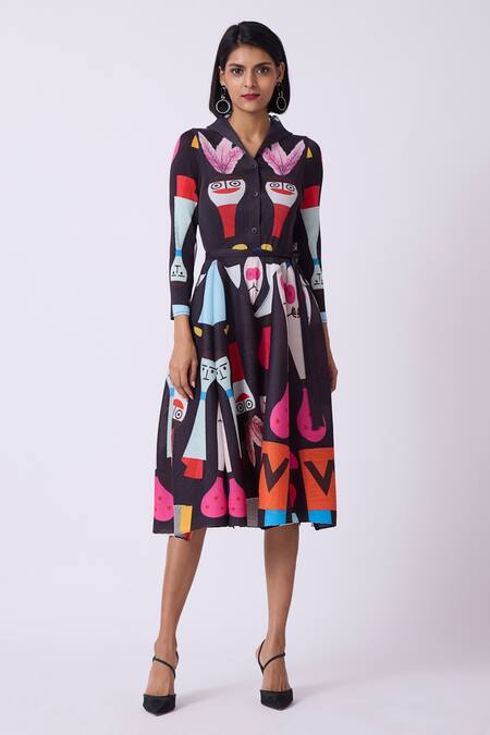 Black pleated shirt dress featuring an all-over multicolor abstract print. Comes with a separate fabric belt for added style.