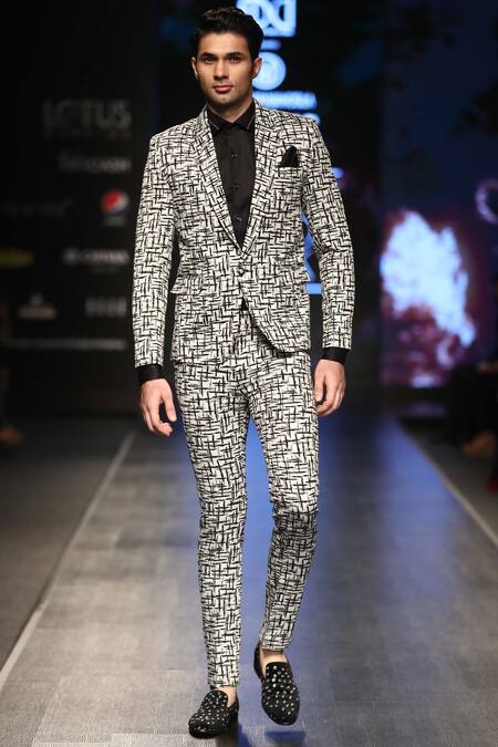 White & black single breasted blazer with abstract print. Paired with printed trousers.
