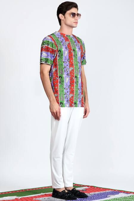 Multi color striped crew neck T-shirt with all-over animal printed motifs.