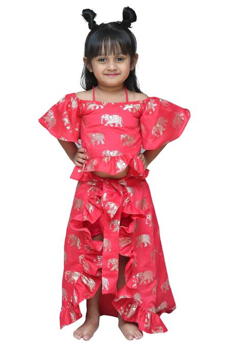 Pink off shoulder top with elephant motif print all over. Comes with a printed detachable frill wrap & matching shorts.