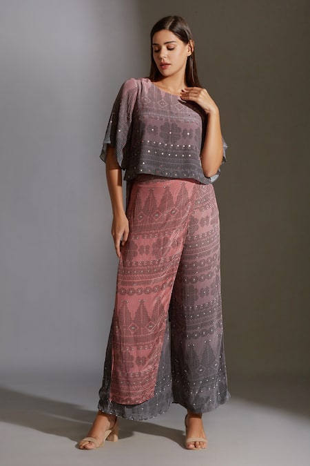 Pink, grey asymmetric tunic with geometric, floral printed motifs & sequin work. Paired with printed flap pant.