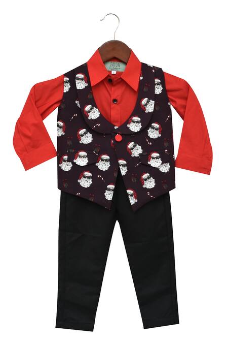 Showcasing a Santa Claus printed brown waist coat. Coordinated with a red shirt and black pants and crafted out of luxe fabrics, this set -of-three ensures your adorable son looks cute as a button.