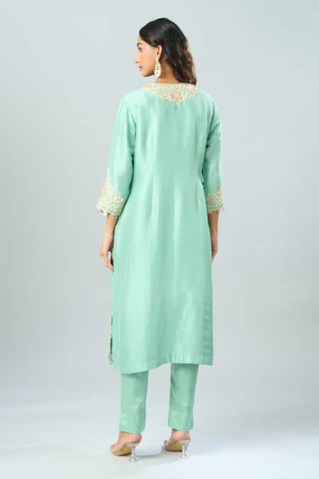 Blue straight kurta featuring floral embroidery with pearl, bead, resham, and lampi work. Paired with a coordinating pant and an embroidered sheer dupatta.