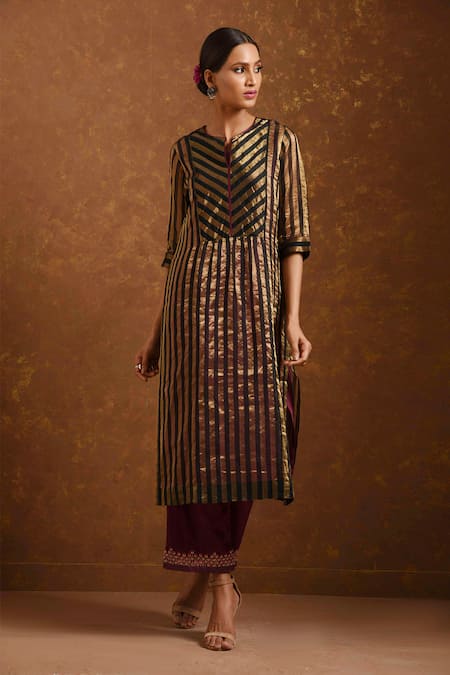 Black Handwoven Tissue Stripes, Mashru V Neck Kurta And Pant Set