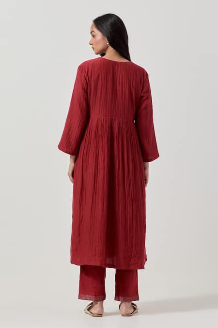 Red kurta featuring floral thread embroidery on the yoke with sequin detailing and flared sleeves. Paired with a matching pant for a complete look.