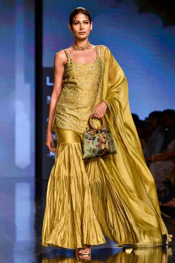 Dry heena green sleeveless kurta with leather resham work in floral motifs. Paired with gharara & organza silk embellished dupatta.