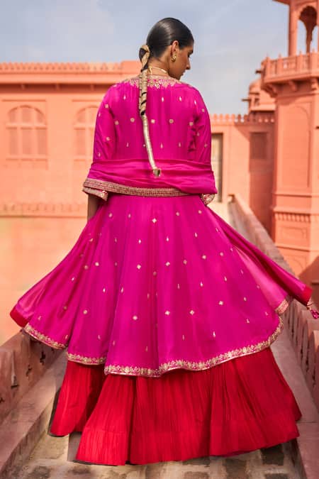 Red anarkali featuring intricate marodi and zardosi embroidery. Paired with a pink jacket and a matching dupatta.