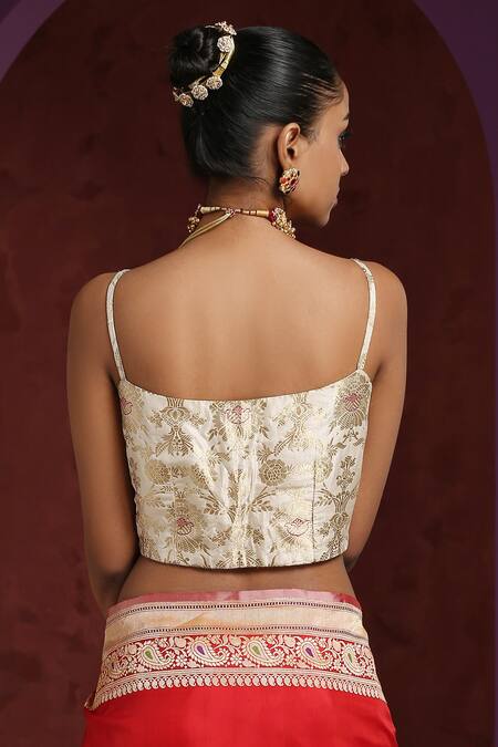 White handwoven brocade blouse featuring floral patterns, square neckline, and thin straps